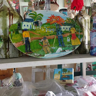Ao chegar no ateliê, com fachada colorida somos recebidos por muita alegria de Donizett e Marina, artistas da cidade responsáveis pelo espaço onde comercializam artesanatos de artistas da cidade e ensinam pintura, bordado e crochê. Tomando um chá e conversando sobre os trabalhos Donizett me mostrou algumas pinturas e disse "Precisava de um espaço o triplo desse viu" enquanto organizava material que ia recebendo. Pois é, o ateliê é repleto de trabalhos e a gente realmente precisa reservar bastante tempo para ver tudo, mas respondi " mas para artista, Donizett, qualquer espaço que tiver é pouco, isso é bom né?"